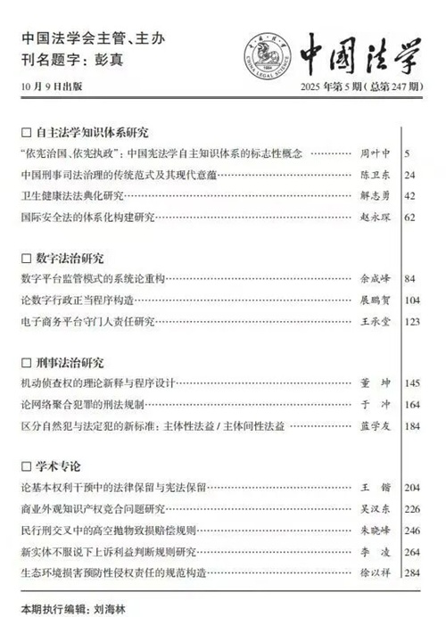 副教授展鹏贺在法学权威期刊《中国法学》2025年第5期发表论文《论数字行政正当程序构造》。