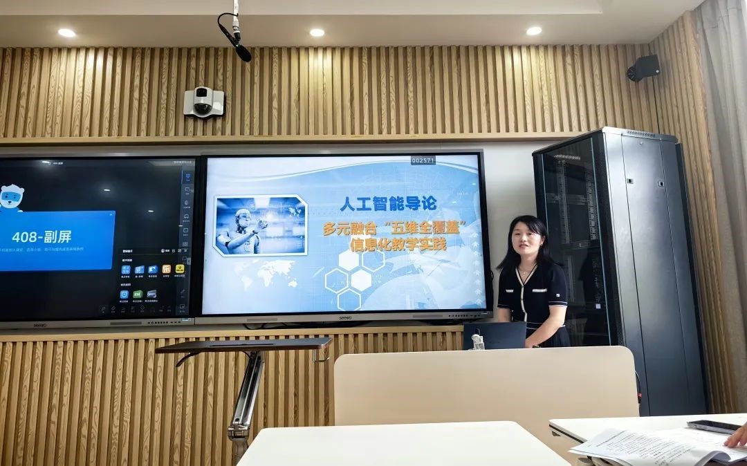 来自信息科学与工程学院的许莹老师以“多元融合‘五维全覆盖信息化教学实践’”为题介绍了信息化教学在《人工智能导论》课程中的运用。信息化技术与手段覆盖了该课程教学中的“教、学、训、评、研”各个环节。许老师还强调在省赛作品准备过程中要重视提炼特色,信息化资源在精不在多。