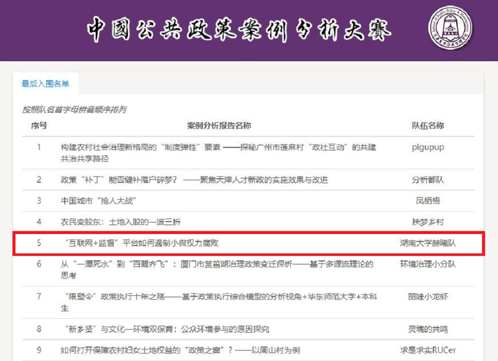 在实地调研收集到大量数据的基础上,7月31日,赫曦队案例分析报告《“互联网+监督”平台如何遏制小微权力腐败——以湖南麻阳为个案》提交大赛组委会进入匿名评审环节。8月14日,大赛决赛名单公布,博彩平台