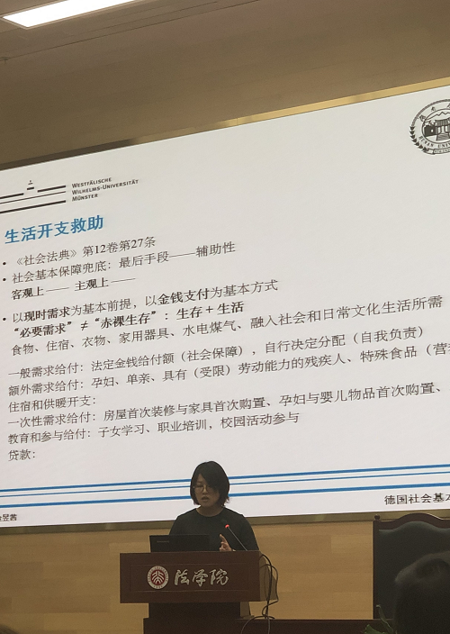 教师在金昱茜以“‘自我负责’与‘社会保障’——德国社会基本保障‘网’”为主题作出报告。金昱茜从德国社会保障体系的两次重大调整出发,对其报告主题作出说明,分别说明了德国社会基本保障的四个层级的“网”,并以此为中心提出我国社会基本保障体系建设中应注意国家个人责任划分与衔接问题。