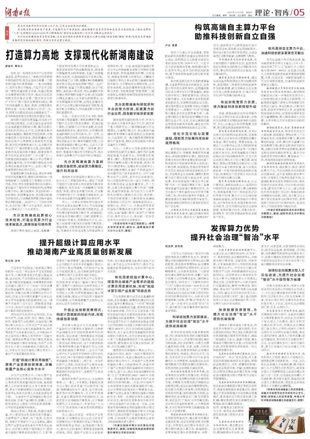 习近平总书记指出:“要运用大数据提升国家治理现代化水平。要建立健全大数据辅助科学决策和社会治理的机制,推进政府管理和社会治理模式创新,实现政府决策科学化、社会治理精准化、公共服务高效化。”大数据的快速处理和高效利用,依赖于高水平的算力支持和算法创新。湖南顺应发展需要,及时出台了《湖南省强化“三力”支撑规划(2022—2025年)》,提出强化算力支撑,到“十四五”末期努力建成全国先进的绿色算力枢纽和国际领先的算法创新中心。如何充分发挥湖南算力优势,将“算力”转化为“治力”,进一步提升社会治理“智治”水平,是我们致力高质量发展时面临的重要课题。