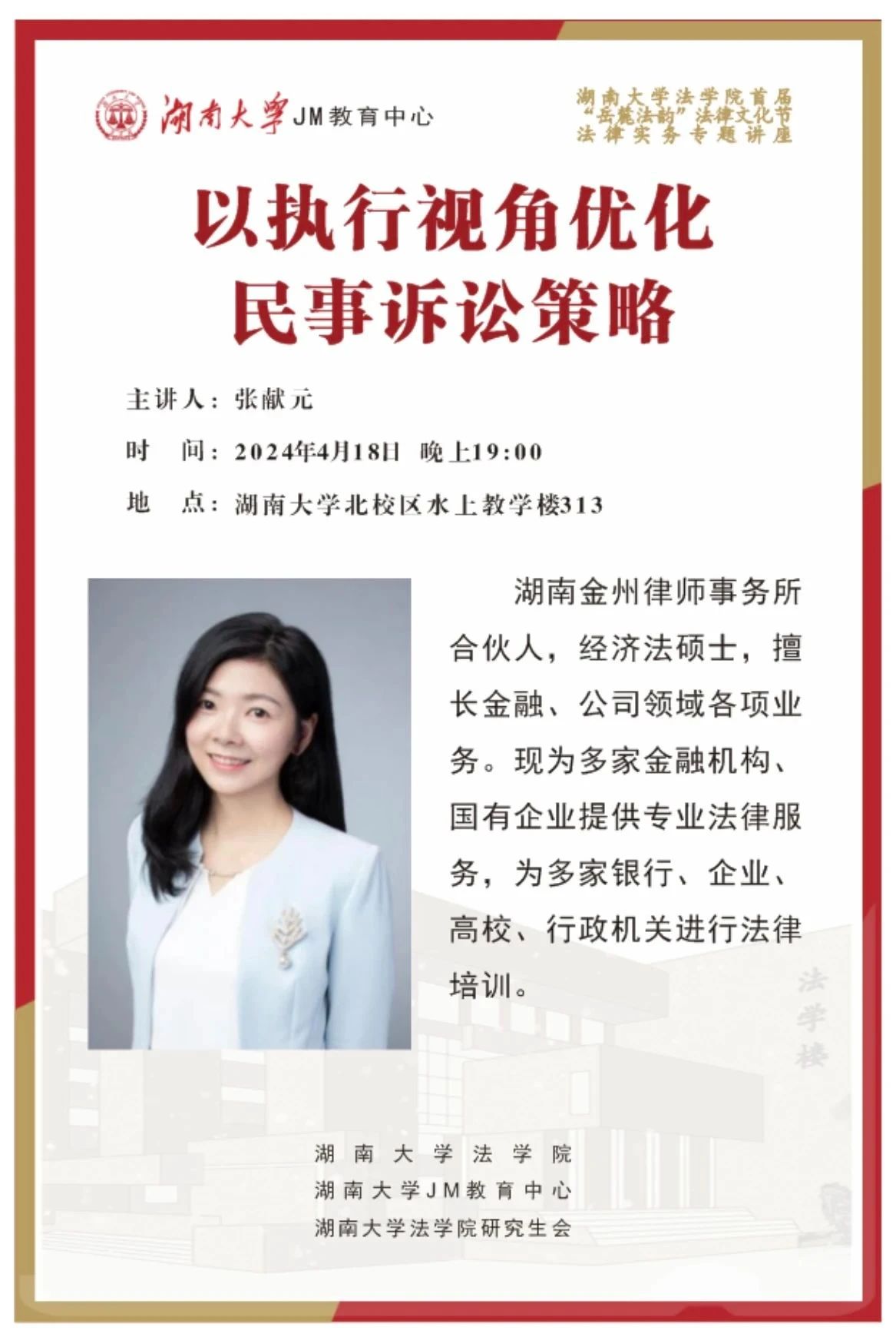 北校区开展JM实务讲座,讲座主题为“以执行视角优化民事诉讼策略”。