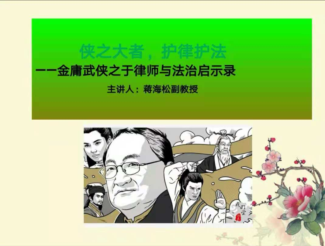蒋老师在讲座指出,从正向而论,侠客与律师契合良多,如抑权督政的民间道义,唇枪舌剑的辩护技能, 辩冤白谤的维权死磕,一诺千金的品牌塑造,沧海纵横的自由风范。而从反向而论,这个血腥的江湖也警醒世人,诸多侠客自己无解的困局昭示天下,能够主持正义的,并不是侠客,不是青天,而是注重公正与程序的法律制度,这制度下最像侠客的,可能是为权利而斗争的的律师一族。在此意义上,武侠的江湖世界恰好证成了法治与律师存在的意义。金庸笔下的大侠境界是“侠之大者,为国为民”,而从法治的意义上可以说,“侠之大者,护律护法”,为法律精神而奋斗才是更具有普遍意义的行侠仗义。
