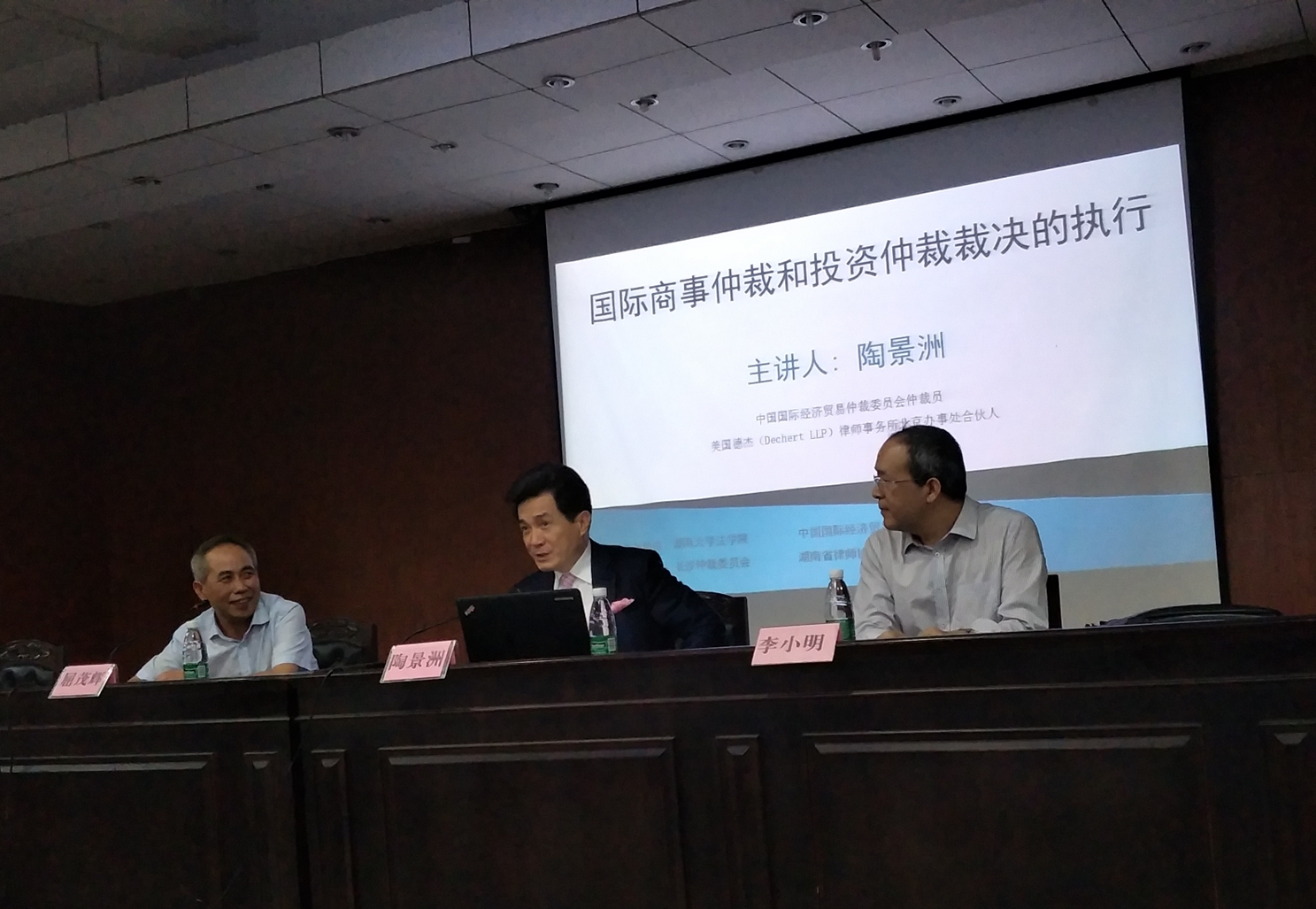 模拟法庭进行了名为“国际商事仲裁和投资仲裁裁决执行”的精彩学术讲演。陶先生是77级北大法学毕业生,也是我国恢复高考后第一批公派留学研究生,在国际商事仲裁领域享有很高的声望。陶先生的讲座现场座无虚席,在座听众不仅有来自高校的学生,还有来自律师界、仲裁界的朋友们。