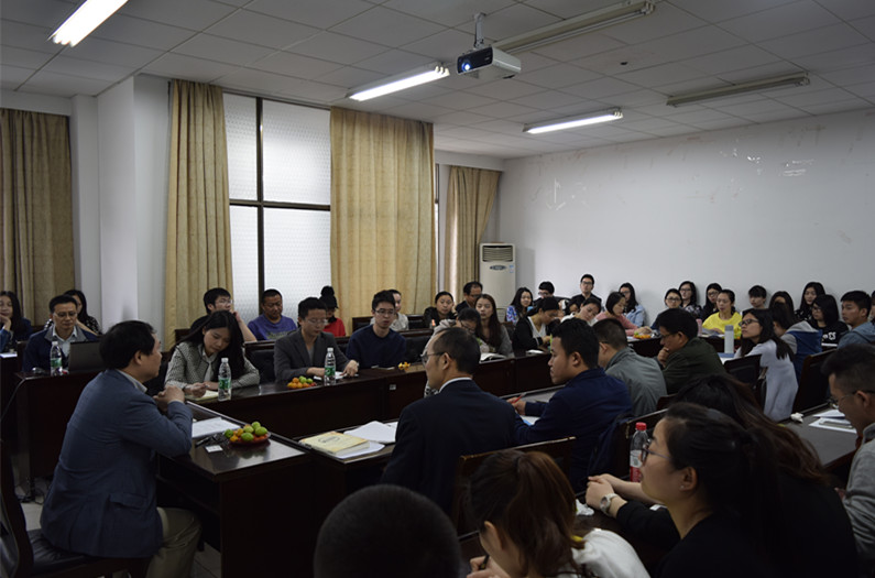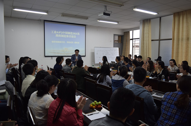 授课表示热烈的欢迎。此次讲座,殷林波副主任的授课主题为“政府职能转移:《中国制造2025》与湖南制造强省行动计划”。首先,殷林波副主任从新一轮科技革命出发,详细地介绍了新一轮科技革命的特征和新一轮产业变革的趋势,进而从工业4.0着手,分析了我国和欧美发达国家在工业4.0时代背景下的主要战略,并进行了比较分析;其次,殷林波副主任从指导思想、基本方针、战略目标、战略任务、突破重点和具体流程这几个方面带我们深入了解了中国制造2025的总体要求。同时,分析了我国制造业大而不强的原因,认为可以归结为自主创新弱、产品质量不高、产业结构不合理和资源环境的承载力接近极限这四个方面;最后,在对我国制造2025的具体分析之后,殷林波副主任讲述了我省在制造强省建设方面的现状,从多个方面论证了我省是制造大省,同时分析了我省在推进制造大省建设中将面临的机遇与挑战,并阐述了我省在制造强省建设方面的战略目标和基本思路。