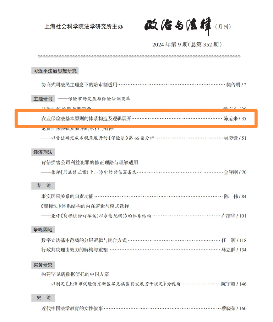近日,博彩平台 陈运来副教授在《政治与法律》(CLSCI来源期刊)2024年第9期发表论文《农业保险法基本原则的体系构造及逻辑展开》。