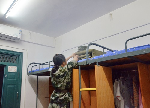 内务整理也是军训必修课,训练结束回寝之后,新生们在教官的指导下学习内务整理。同寝室的四位新生分工合作,一丝不苟地完成寝室的卫生清扫。叠被子对新生而言挑战较大,但同学们认真观看教官演示,主动向表现突出的同学请教,互相帮助,互相学习,交出合格答卷。