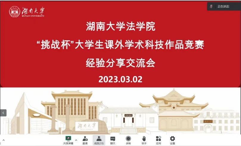 会议伊始,罗英老师首先向在此次经验分享交流会进行分享总结的三位优秀学生表示了感谢。接着,罗老师向同学们分享了自己对挑战杯的看法,她认为挑战杯对于大学生来说是一次培养实践创新精神的宝贵机会。同时她还鼓励同学们积极参与挑战杯等各种创新创业类竞赛,努力成为一名更加优秀的法律人。