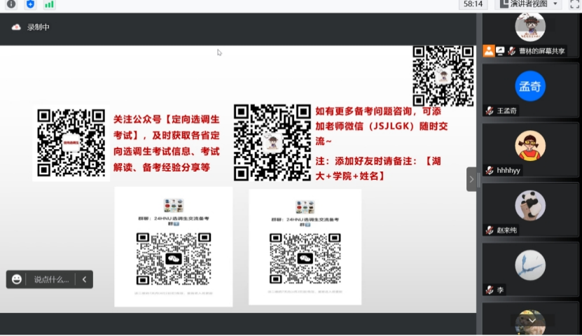 27日,余良老师对中央定向选调和北方各省份定向选调的考情进行讲解,介绍各省份考试时间、报考条件等信息,并重点解读北京、天津、河北、山东、山西等地区定向选调政策,介绍“青选计划”、“墩苗计划”等选调方案,并建议同学们选择对口岗位进行备考,为同学们提供了宝贵的备考经验。