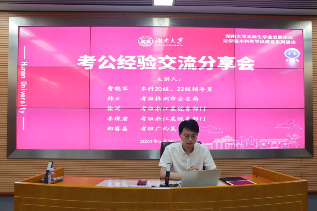 为帮助同学们更好地了解公考、备战公考,5月29日晚,举办公考经验分享交流会。本次分享交流会邀请了辅导员曹晓军老师、考取株洲市公安局的韩正、考取浙江某税务部门的徐涛、李璨君、考取广西某检察院的郑睿嘉为同学们分享分析就业形势、分享公考经验。
