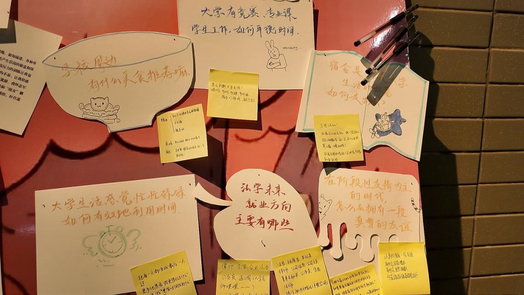 除了真诚的感悟,还有多样的提问,同学们就新学期、新环境、新课业做出了自己的思考与发问,围绕时间利用、学习方法、未来方向以及生活遭遇、周边美食分享等主题,提出自己心中的疑问。工作人员将这些问题在展板上展出,吸引了众多学姐学长的驻足与回答,每一个问题下,都留下了学姐学长们耐心细致的回答与满含深情的鼓励,它们如同温暖的阳光,照亮了新生前行的道路。