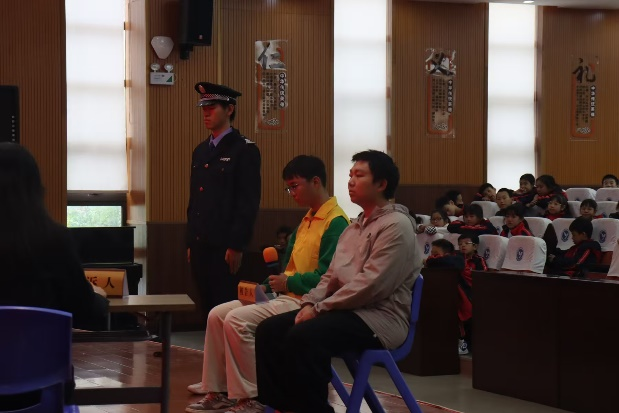 团委实践部筹备之下,志愿者们为大家带来了一场别开生面的精彩表。从威严庄重的审判长,到据理力争的控辩双方,再到神情各异的证人,每一个角色都鲜活饱满。场景的逼真还原、台词的严谨专业、情节的真实还原,仿若真实法庭审判的生动复刻,生动演绎了被告金啸天利用小学生散布在网络上的信息假冒教育局工作人员诱骗其家长到教育局转账的案子。同时借助模拟法庭表演这一形式,小学生们得以更为直观且生动地研习法律知识,深刻领悟法律的内涵与要义。