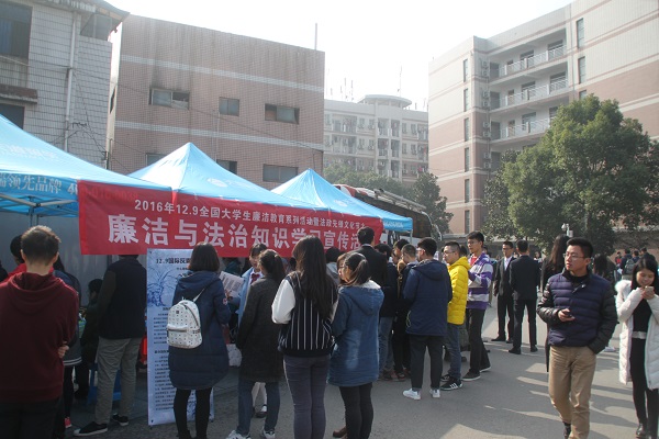分团委、学生会和青年志愿服务团组成了廉政与法治知识宣传小分队携带《公民法律常识1000问》等普法书籍和同学们自己编印的宣传单,深入天马安置小区、科教兴村等地开展宪法知识与廉洁知识宣传教育活动,向周边居民普及法律常识,宣传廉洁知识。志愿者还在岳麓书院向来往的游客宣讲党的十八届六中全会精神,普及国家宪法日和国际反腐败日的相关知识,并组织了现场签名活动,得到了游客的积极参与和支持。