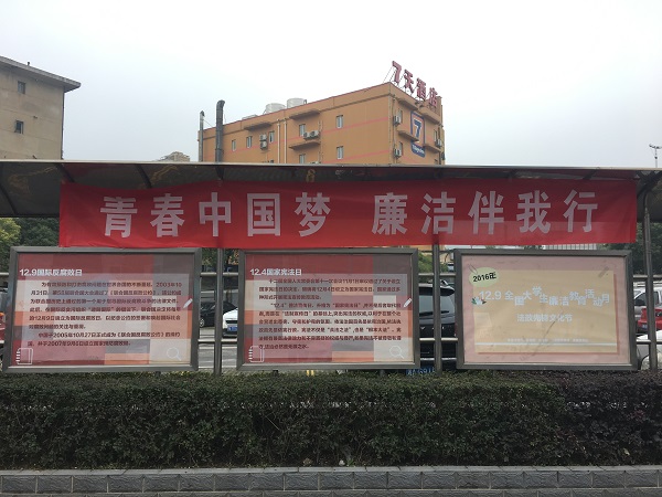 天马学生公寓宣传栏,以学生喜闻乐见的方式宣传廉洁与法治知识。