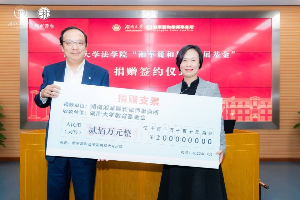 据悉,湘军麓和律师事务所是一家专注于重大疑难复杂诉讼案件和为客户提供一站式法律风险解决方案的大型综合性律师事务所,整体规模和实力位居湖南前列、中部领先。先后被评为全国优秀律师事务所、全国律师行业先进党组织,并被确立为司法部律师行业党建示范点。本次捐资200万元设立“湘军麓和法学发展基金”用实际行动体现了湖南本土强所应有的社会责任和人文关怀。未来,湘军麓和将继续秉承“客户至上、诚信执业、勤勉服务、以法助人”的办所宗旨,在不断追求卓越法律服务和自身发展壮大的同时,在公益法律服务、教育扶贫、持续发展慈善等公益活动中自觉承担更多的社会责任。