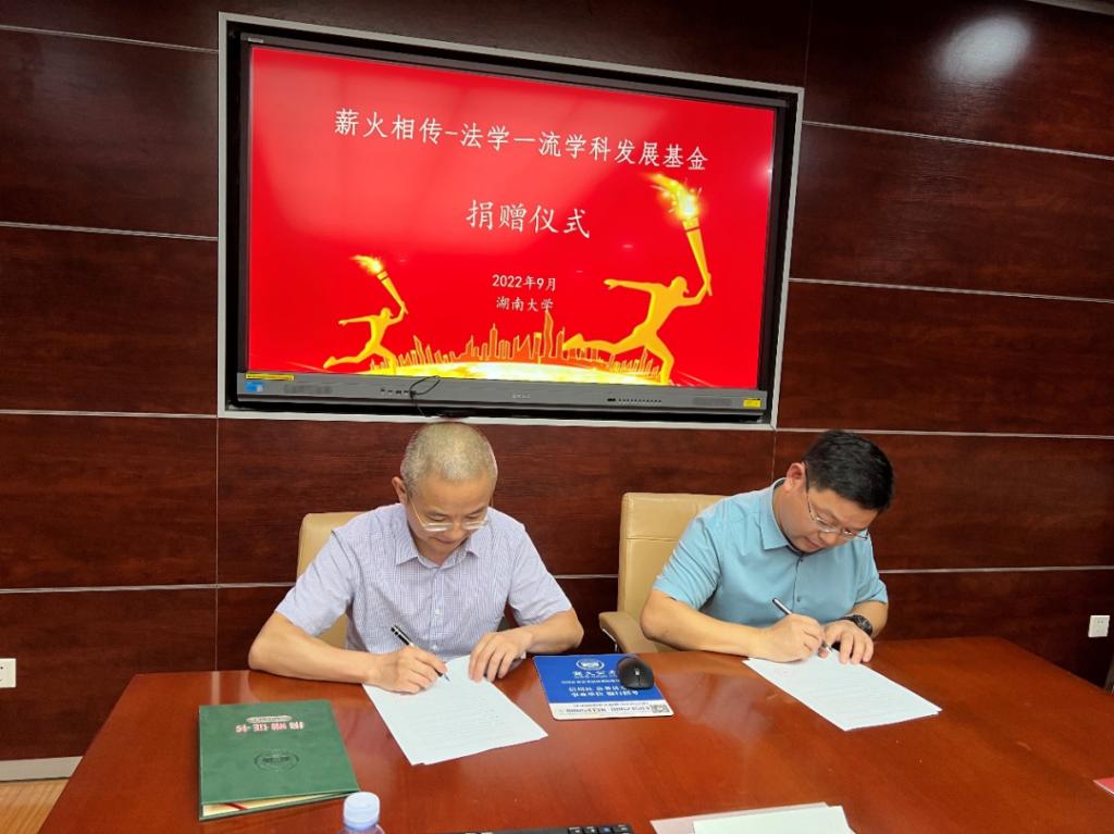 湘江水满,麓山枫红,2022年9月20日下午,法学楼405会议室隆重举行薪火相传-法学一流学科发展基金捐赠仪式。