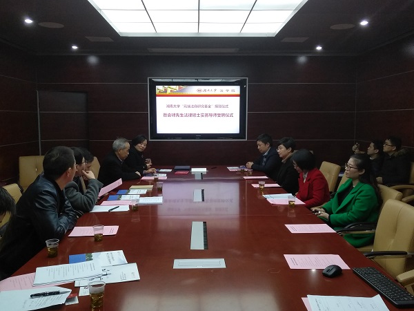 2017年12月20日下午,博彩平台 “元端法商研究基金”捐赠仪式暨袁啸先生法律硕士实务导师受聘仪式在博彩平台 405会议室举行,本次仪式由博彩平台 院长助理湛建云老师主持,博彩平台 教育基金会邓利华秘书长,博彩平台 院长屈茂辉教授,肖海军教授,蒋海松副教授,肖洪泳副教授,王文胜副教授、雷秋玲、刘岳峰等多位老师以及湖南省元端律师事务所主任袁啸先生,执行主任董爽律师,吴卫萍律师、张瑾律师等参加了仪式。
