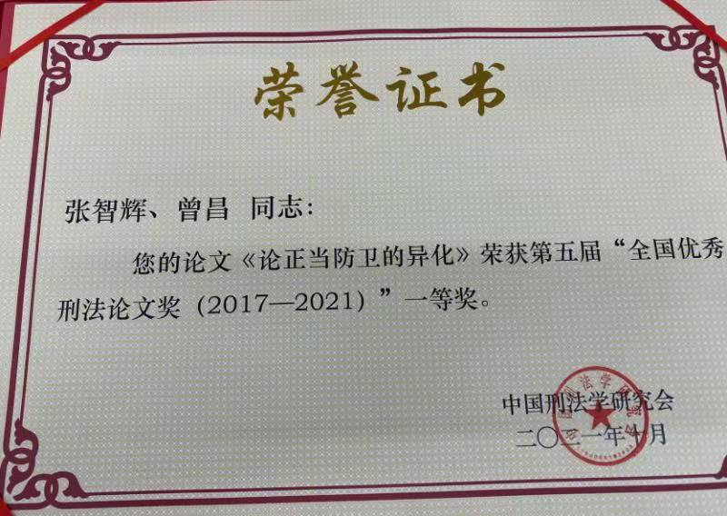 张智辉教授、曾昌博士研究生合著《论正当防卫的异化》一文被评为第五届全国优秀刑法论文奖(2017-2021)一等奖,博彩平台