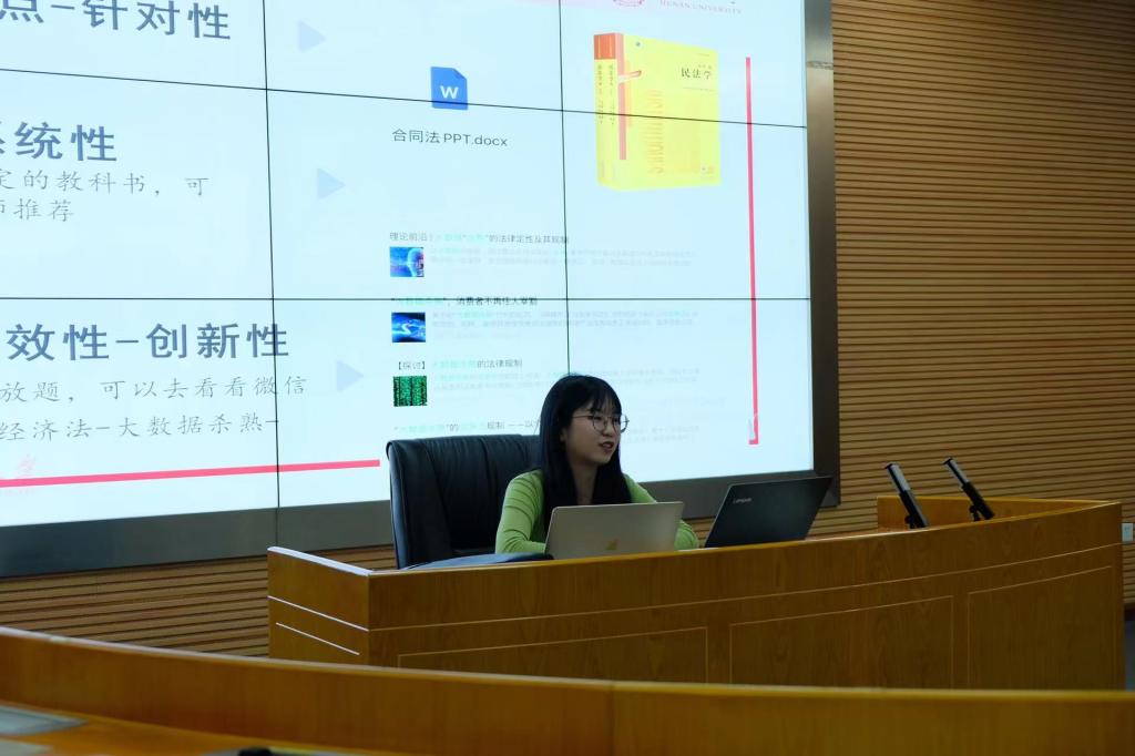 陈潇以“有的放矢,定位好每一阶段的自己”为主题,结合自身经历,从课堂、实践、考试和就业四个方面进行分享。陈潇建议同学们在每一个阶段要找准主要矛盾,研一要紧抓法考与课业,研二要注意校内外实践,研三为论文和就业做好准备。