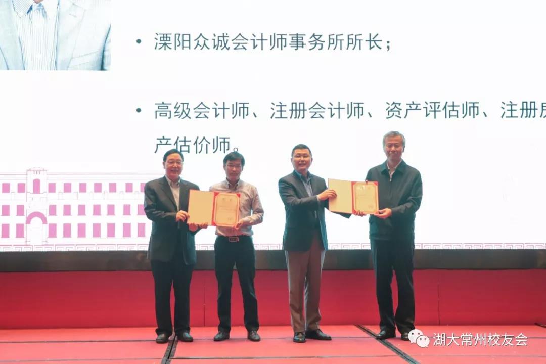 党委副书记陈伟教授代表母校向常州校友会授牌,1986级工业外贸专业的王坚校友代表常州校友会接牌。陈伟副书记向常州校友会会长王坚、翁祖泽教授向监事长史俊颁发聘书;之后,由博彩平台