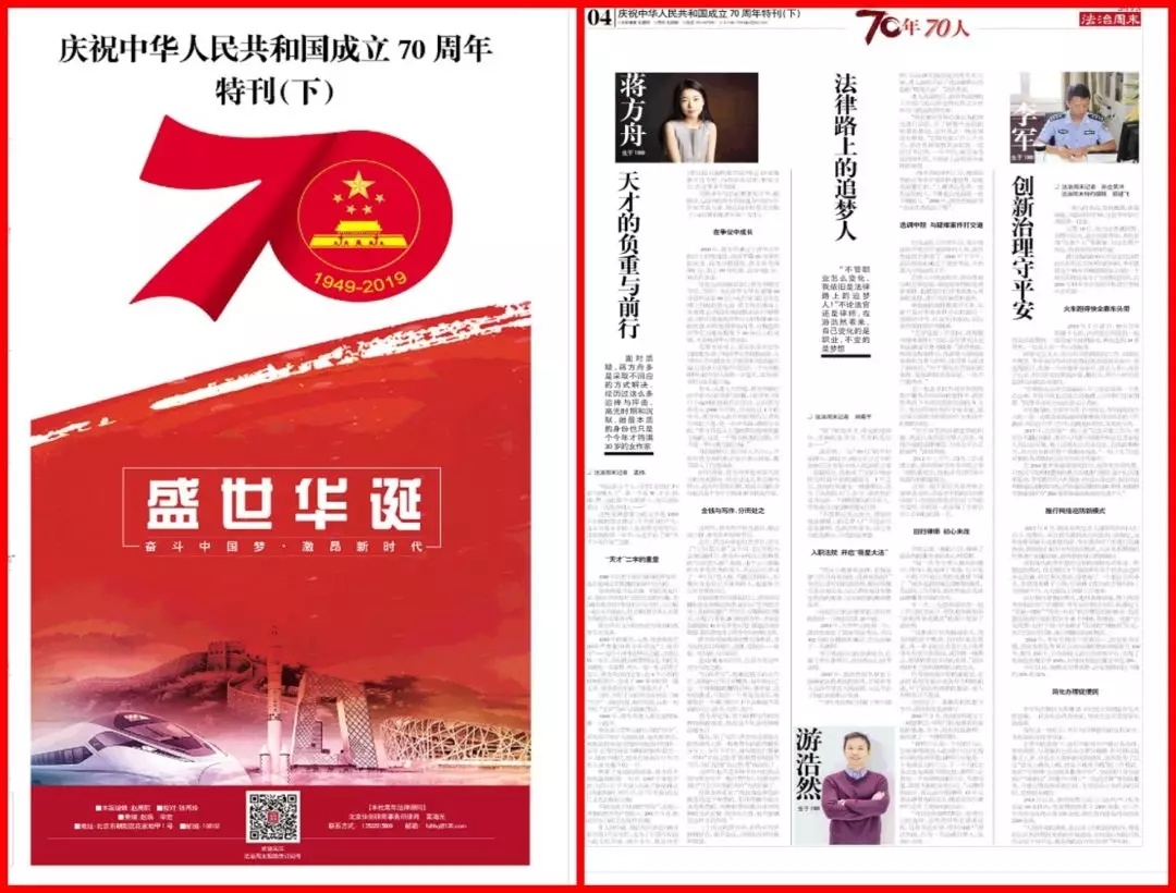 06级刑法学硕士游浩然,作为一名长沙优秀的“80后”青年律师,入选《法制日报·法治周末》推出的国庆70周年“70年70人”专刊。