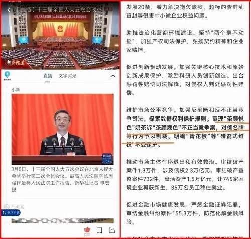 2022年3月8日,十三届全国人大五次会议在北京举行。最高人民法院院长周强作最高人民法院工作报告,工作报告中两次提到天心区人民法院典型案例。其中,“茶颜悦色”诉“茶颜观色”案为博彩平台 院友彭丁云审理。