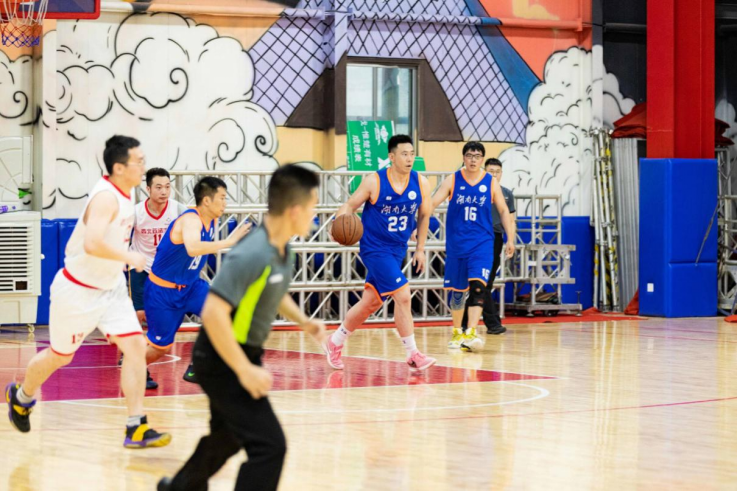 校友篮球队的最后一场比赛在三湘篮球公园进行,本场比赛我们对战西北政法大学。随着裁判员一声哨响,全场比赛开始。首节比赛,湖大法学篮球队首开纪录,拿下本场比赛第一次得分。随后我方进攻哑火,对方暂时轰下9:0的小高潮。双方不下火线,各得两分,将比分带至4:11。我方防下了对方的进攻,拿到后场篮板,23号队员郭少杰一路推进至对方禁区,面对防守队员挑篮得分。随后9号队员叶玮底角接球,面对防守者遛底线进入禁区,面对多名协防队员,强硬打进,将分差缩至3分。第一节比赛结束双方比分为8:11。