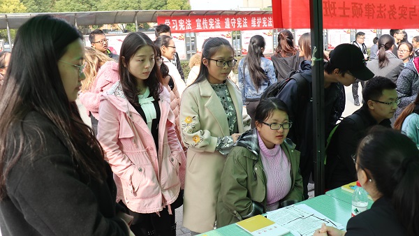 的普法志愿者们也为排队等待提问的同学们分发“法律小常识”宣传单和普法书籍,为同学们普及法律常识。