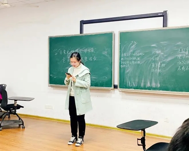 会议伊始,同学们饱含热情与崇敬唱响团歌,充分调动会议气氛。团支书赵玲羽首先上台,从重大意义、丰富内涵、核心要义、实践要求四方面汇报了自己的学习心得和感悟。同时,她希望同学们将党的精神自觉牢记于心中、坚决落实到行动上。随后,她向全体同学公示了班级团支部组织生活会的筹备情况,以便同学们更好地了解本次组织生活会举办的目的和意义。