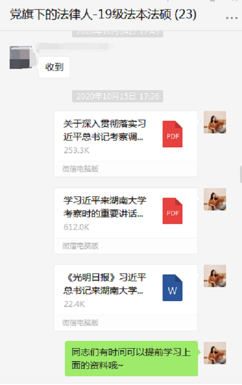 为深入学习习近平新时代中国特色社会主义思想,将学习宣传贯彻落实习近平总书记来校考察调研重要讲话精神引向深入,进一步激励我校研究生牢记习近平总书记殷殷嘱托,不负青春韶华,为实现第二个百年奋斗目标、实现中华民族伟大复兴的中国梦奉献自己的智慧和力量,根据学校党委工作部署,决定于2020年10月16日晚8点在2019级法律硕士(法学)党支部中开展“牢记嘱托、不负韶华,”主题党日活动。
