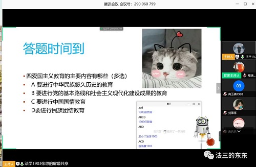 2019级法学三班举行“共抗疫情、爱国力行”线上主题班会活动,会议由班长张思主持,班主任汪叶老师和全体法三同学参加。