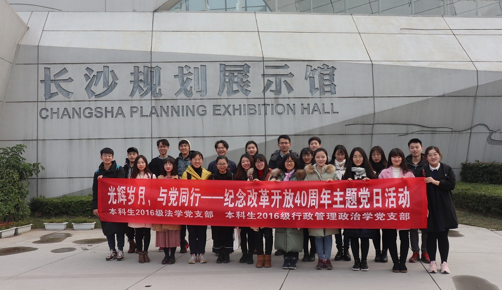 本科生2016级行政管理政治学党支部和本科生2016级法学党支部前往长沙市规划展示馆,联合开展“光辉岁月,与党同行”纪念改革开放四十周年主题党日活动。