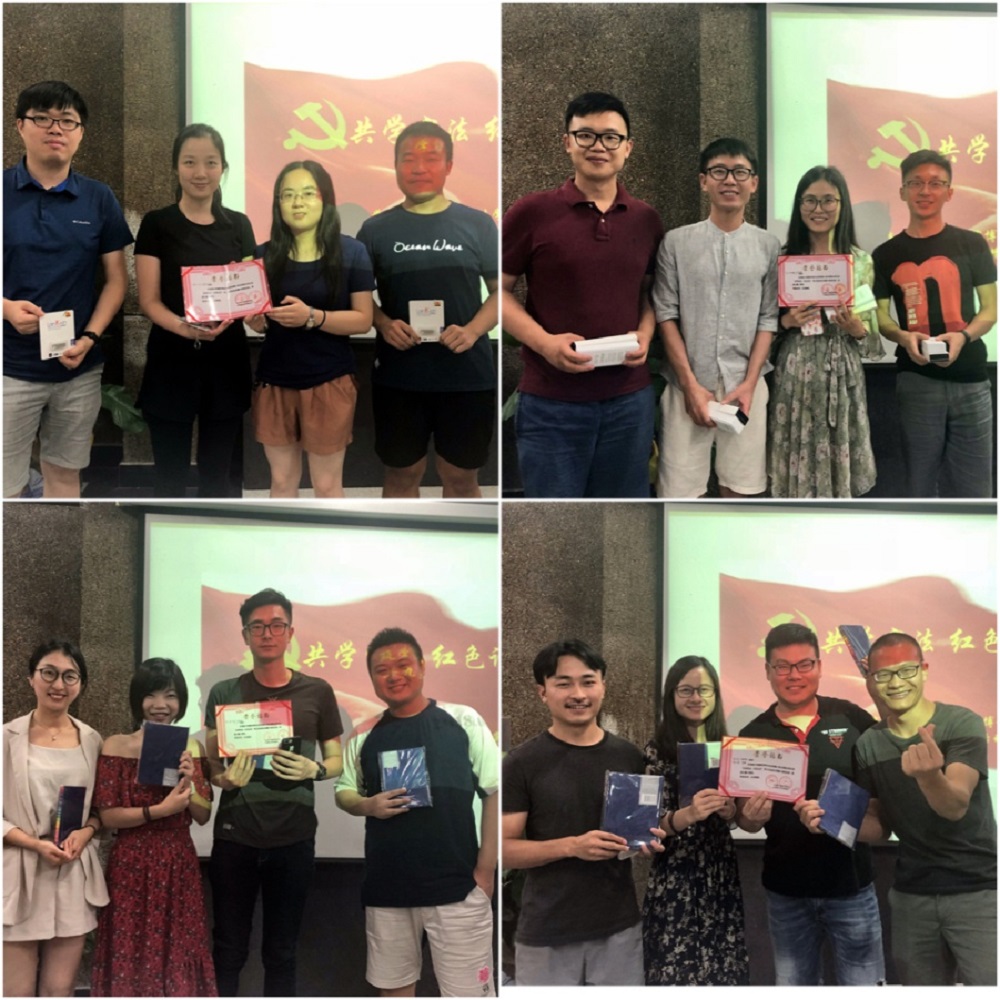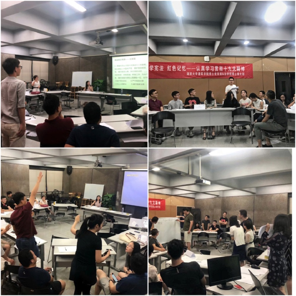 为增进同学的交流,活动负责人提前将两个学院博士生依照男女搭配、学院搭配、年级搭配的原则分为6个小组,共同合作完成相应的任务。整个活动由4个环节组成,第一个环节为每个小组设计LOGO、队名和口号,并一一进行展示,增进成员初步认识;第二个环节是由必答题和抢答题组成的知识竞赛,竞赛内容为新修订的宪法知识,必答题每组都获得了满分的好成绩,通过抢答环节加深了大家对宪法知识的理解和认识;第三个环节是听红歌猜歌名,悠扬的音乐带领大家领略红色经典,追忆往昔峥嵘岁月;最后一个环节是互动性较强的你画我猜红色根据地,小组成员分工明确,建筑学院博士生发挥其专业优势负责绘图,组内其他成员猜答案。最后,根据总分高低评出一等奖1组,二等奖1组,三等奖2组。