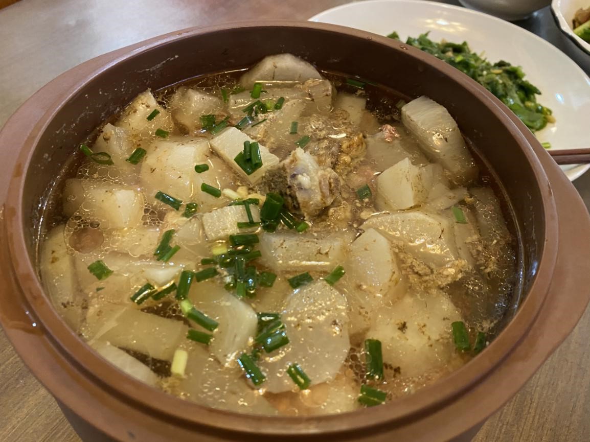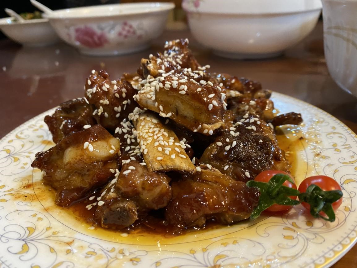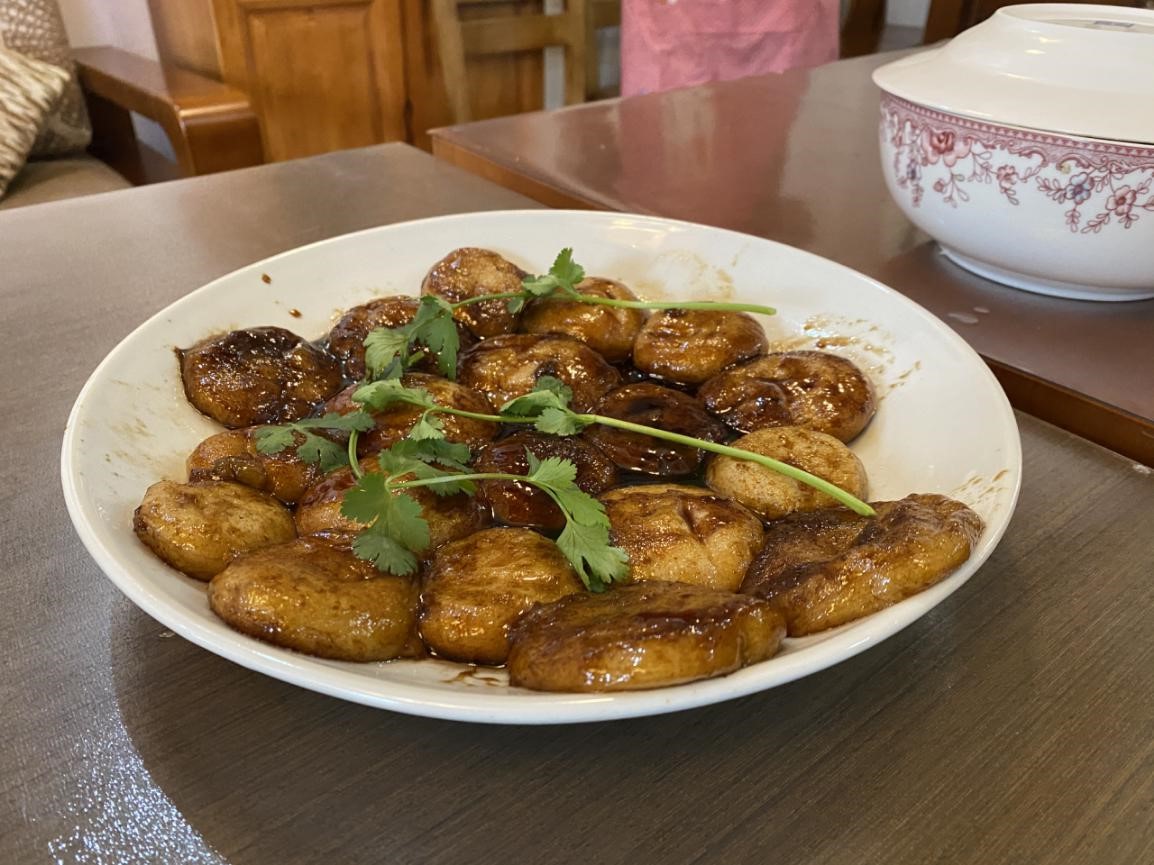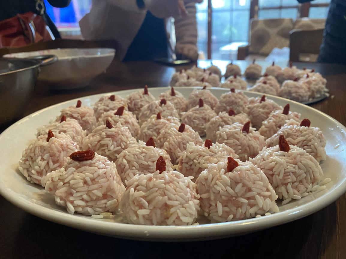 陈锦红老师的珍珠肉丸是当之无愧的颜值担当。圆圆的丸子顶着鲜艳的枸杞,娇憨可爱寓意着团团圆圆、鸿运当头、美满幸福。晶莹洁白的糯米包着鲜香的肉泥,软糯适中的肉丸里,还颇有创意的放入了鲜脆的荸荠,口感十分丰富,让人意犹未尽。