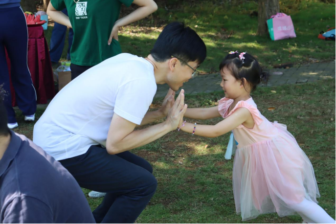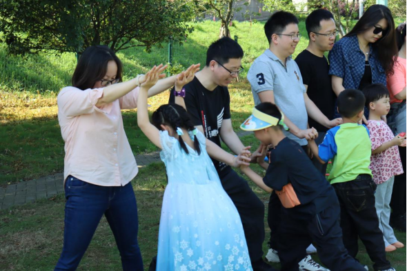 随后,我们进行了“十秒围成圈”游戏,家长和孩子们需要在极短的时间内迅速围成一个大圆圈。这个游戏不仅考验了大家的反应速度,也展现了亲子间的默契配合。紧接着,“桃花桃花朵朵开”游戏让现场的气氛达到了高潮,家长和孩子们手牵手,围成一个大圈,随着音乐的节奏转动,当听到“桃花开几朵”的指令时,迅速组成相应人数的小组,大家玩得不亦乐乎。