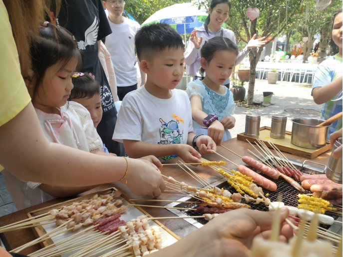 活动最后,美味的烧烤成为了完美的收尾。家长和孩子们围坐在炭火旁,互帮互助,忙碌而有序。欢声笑语中,一盘又一盘香气四溢的烤串成功出炉,大家围坐一起,品尝着美食,分享着喜悦,整个氛围充满了其乐融融的温馨和幸福。