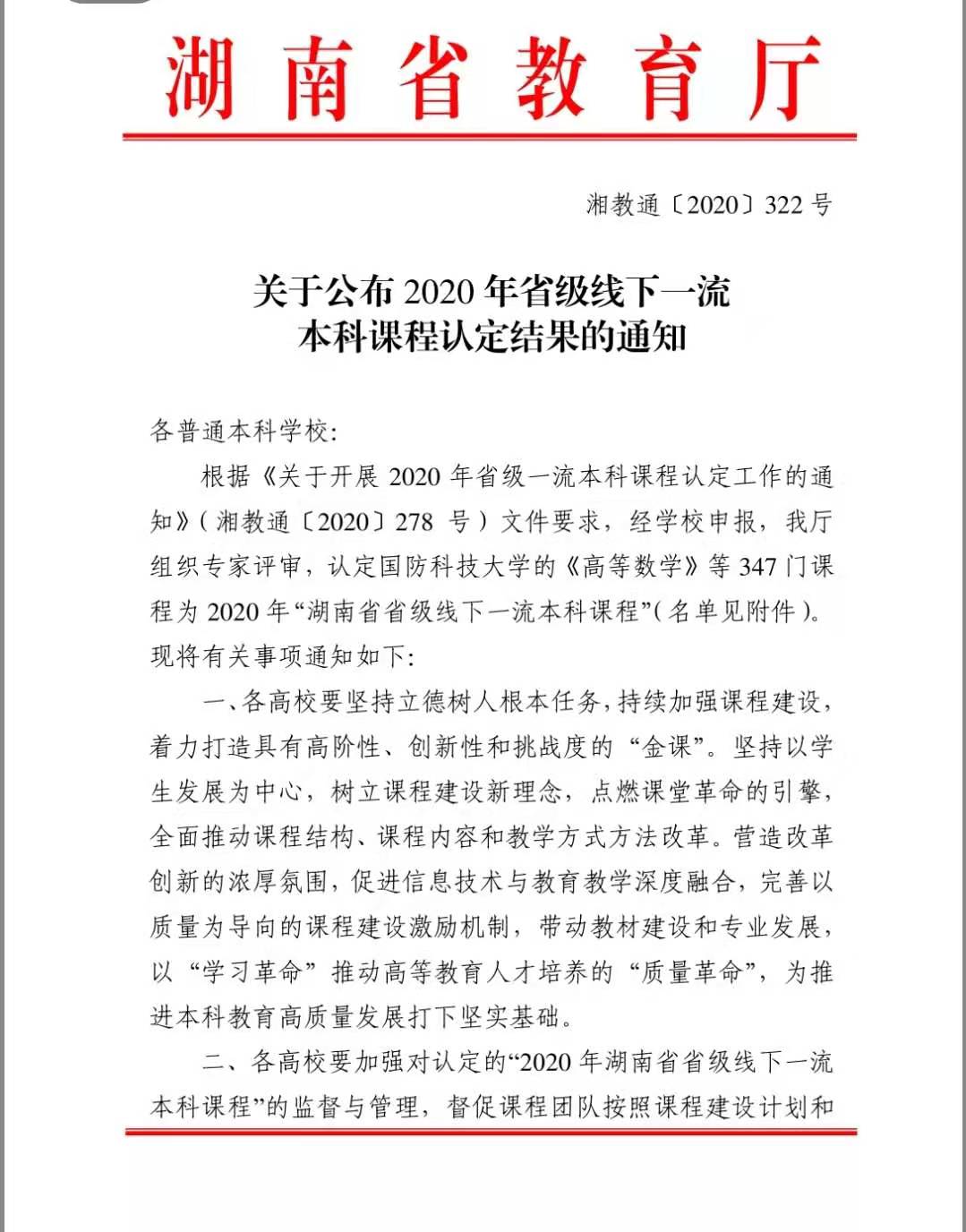 2020年12月26日,湖南省教育厅发布了《关于公布2020年省级线下一流本科课程认定结果的通知》(湘教通[2020] 322号),博彩平台