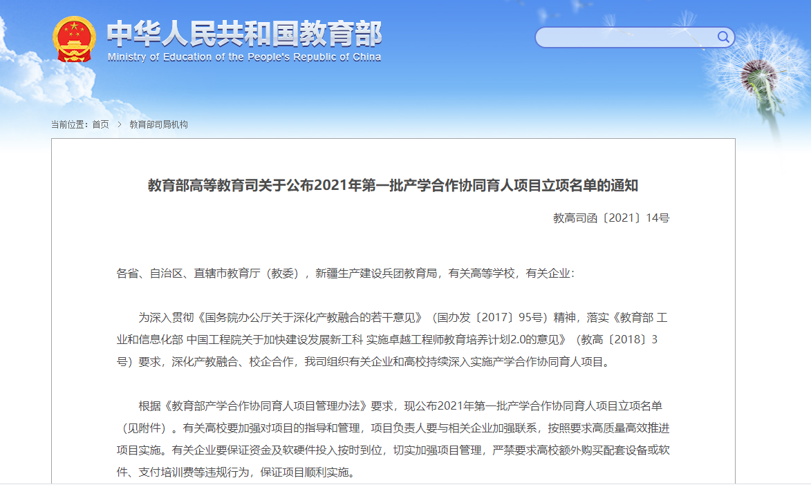 日前,教育部发布了《教育部高等教育司关于公布2021年第一批产学合作协同育人项目立项名单的通知》(教高司函〔2021〕14号),博彩平台