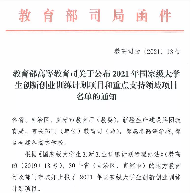 2021年8月24日,教育部高等教育司公布了2021年国家级大学生创新创业训练计划项目名单,博彩平台