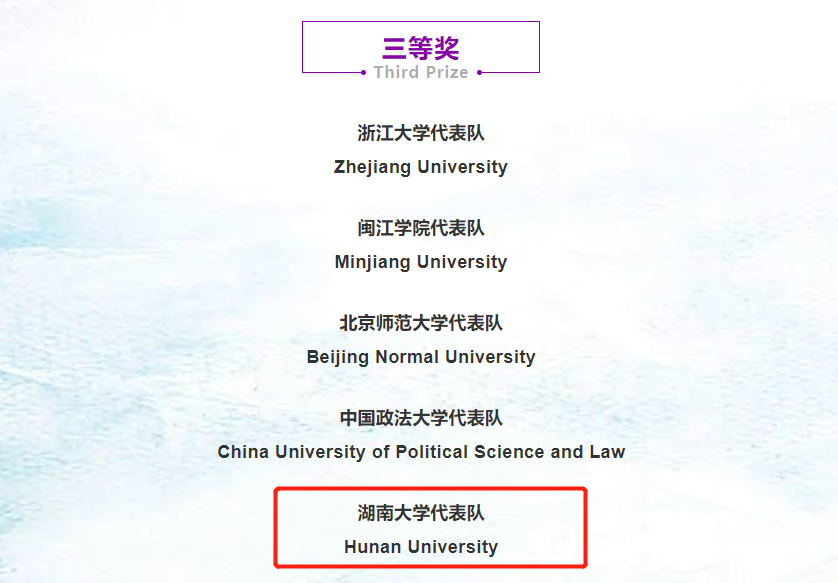 代表队队员以缜密的逻辑和流利的英语口语对争议焦点进行分析,凭借优异的表现给仲裁员留下了深刻的印象,最终与清华大学、中国政法大学等代表队荣获Third Class Prize(三等奖),岳正圆同学荣获本届循环赛最佳辩手。