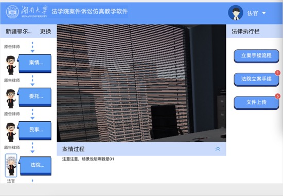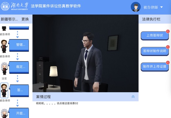 的模拟庭审虚拟仿真实验教学项目,真实还原民事诉讼的全过程,基于司法实践中的真实案例,学生可选择原告代理律师、被告代理律师和法官三种身份,从不同角度参与演练。该虚拟仿真项目对传统的线下模拟法庭有诸多突破之处。本实验教学项目借助WEB、Unity3D、GL、信息技术等虚拟仿真三维建模与交互技术手段,对律师事务所,法庭等场景进行了高度再现,并配以动画模拟,加强了学生的沉浸式体验,增强了角色代入感。