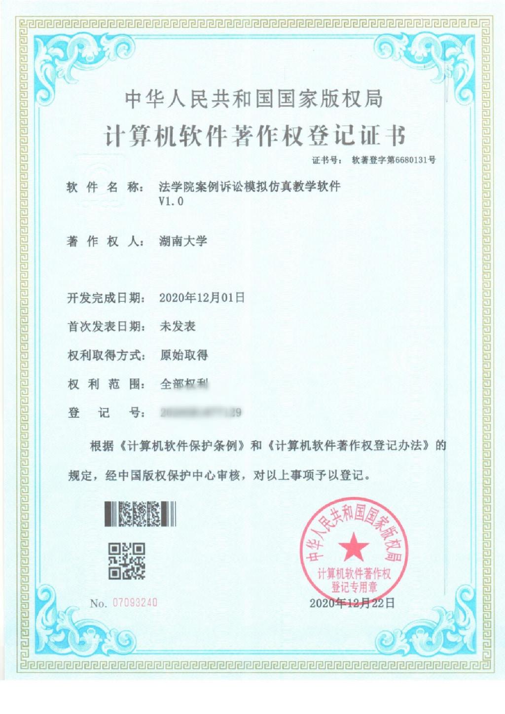 卓越法治人才教育培养基地法律虚拟仿真实验室通过学院验收,并于 2020年12月22日正式取得《计算机软件著作权登记证书》,标志着虚拟仿真实验室二期建设取得重大进展。