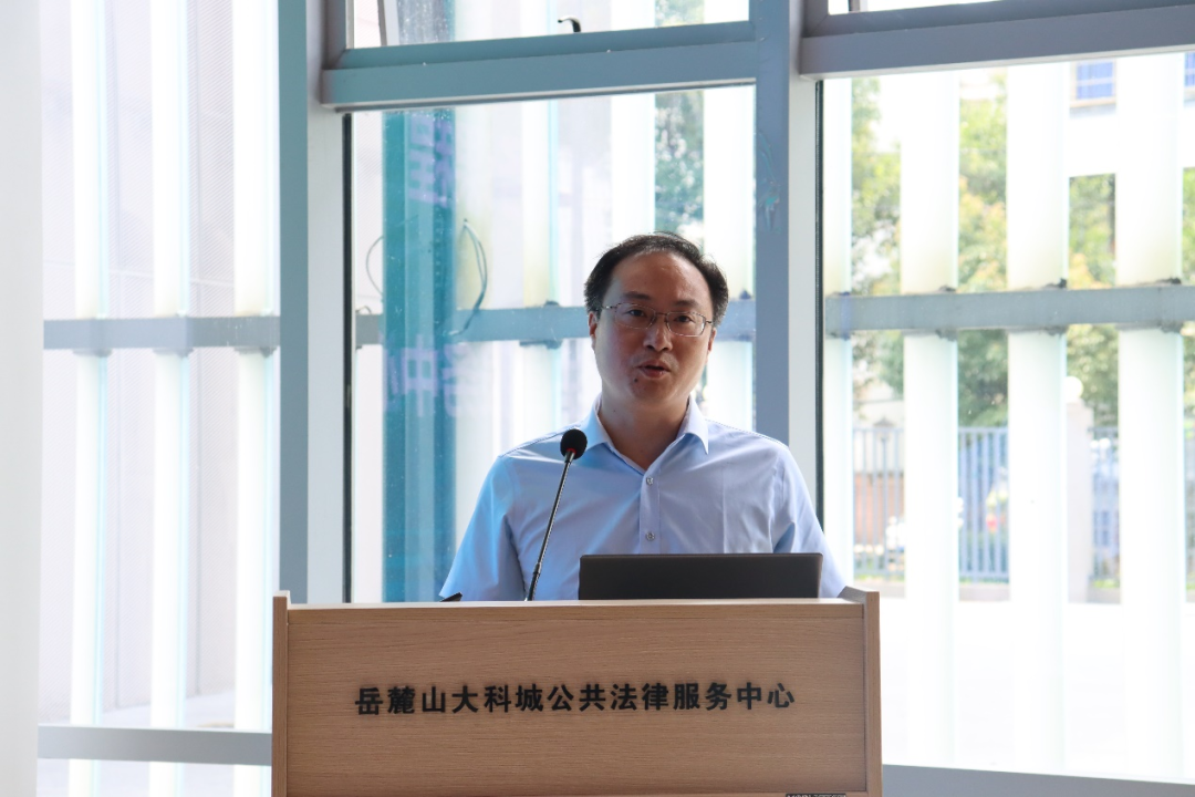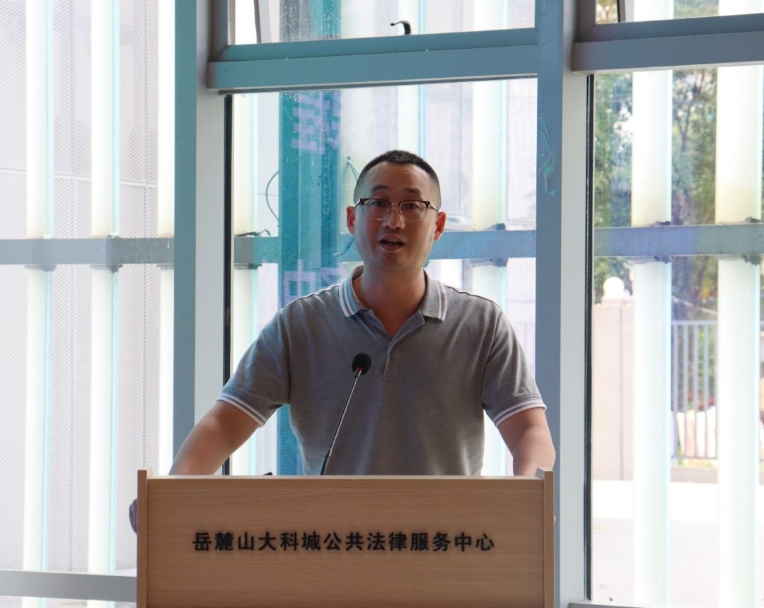 活动伊始,长沙市公共法律服务中心主任李喆做主题发言。他从公共法律服务概念、组织设立的功能、商事调解三方面展开为同学们全面介绍岳麓山大科城公共法律服务中心。