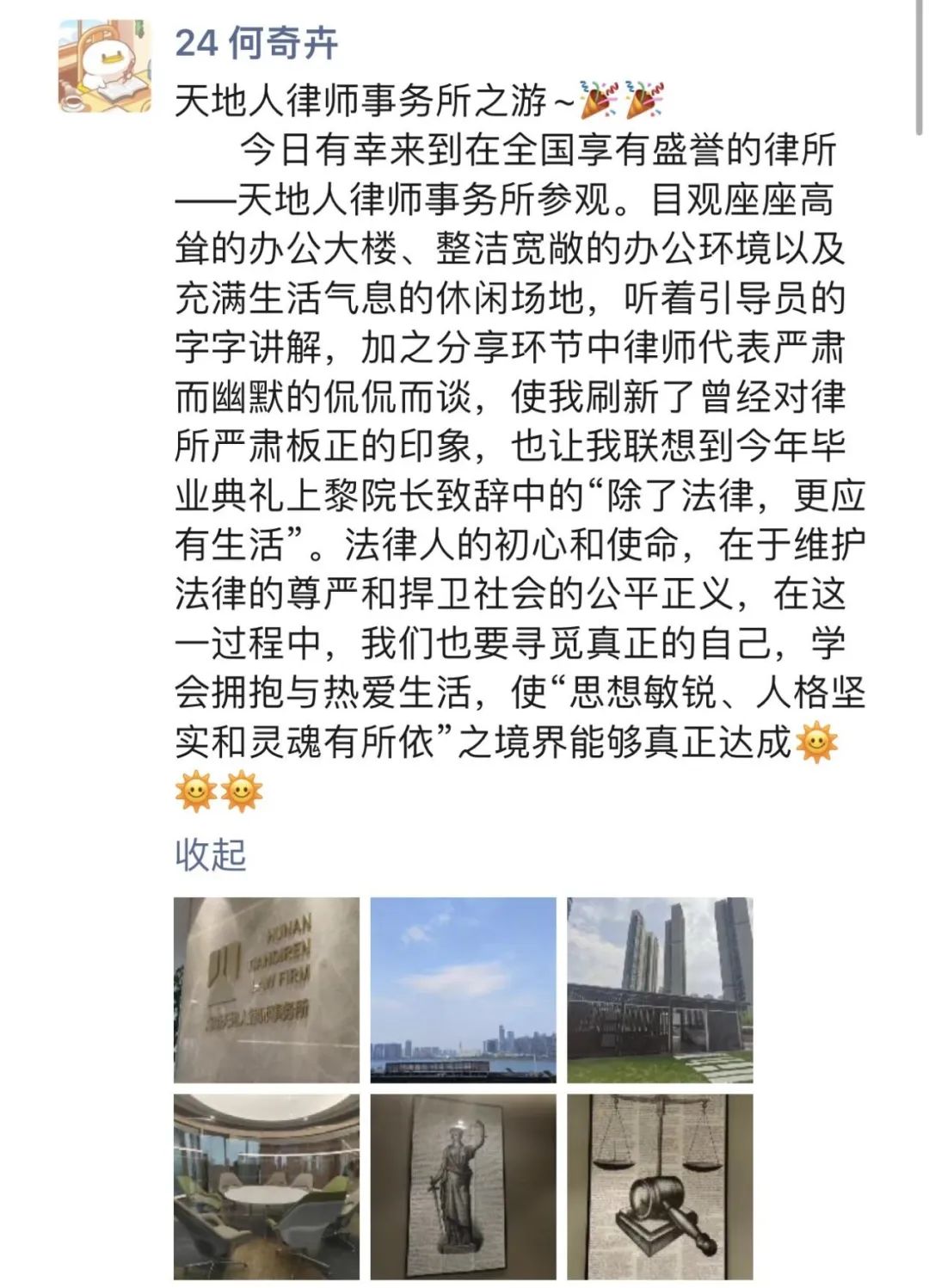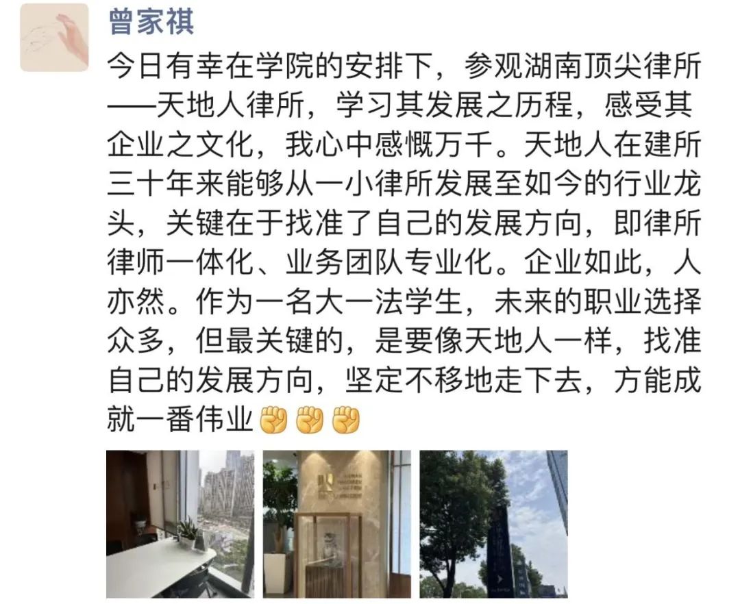 天地人给同学带来的不只是信息的拓展,更是对青年律师的赋能与鼓励。“鹰隼试翼,风尘翕张;奇花初胎,矞矞皇皇”不只天地人的青年律师,更有正在学习的同学都正值青春。这腔青春难凉之热血,正是未来中国法治的栋梁。