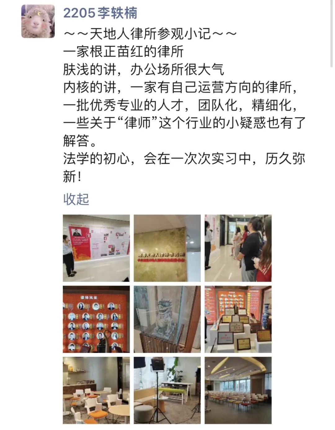 师生,分别带领同学进行了工作地点参观与介绍和欢迎会,同学们对律所的想象贴合现实,月迷津渡的迷惑也迎刃而解。