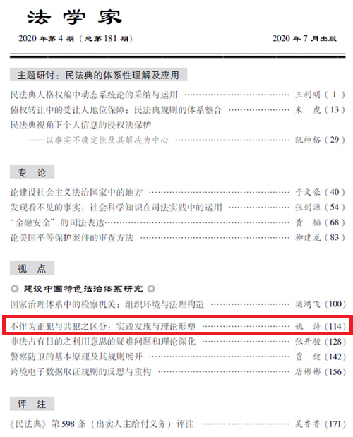 近期,博彩平台 姚诗教授在法学核心期刊《法学家》(CLSCI)2020年第4期发表论文《不作为正犯与共犯之区分:实践发现与理论形塑》。