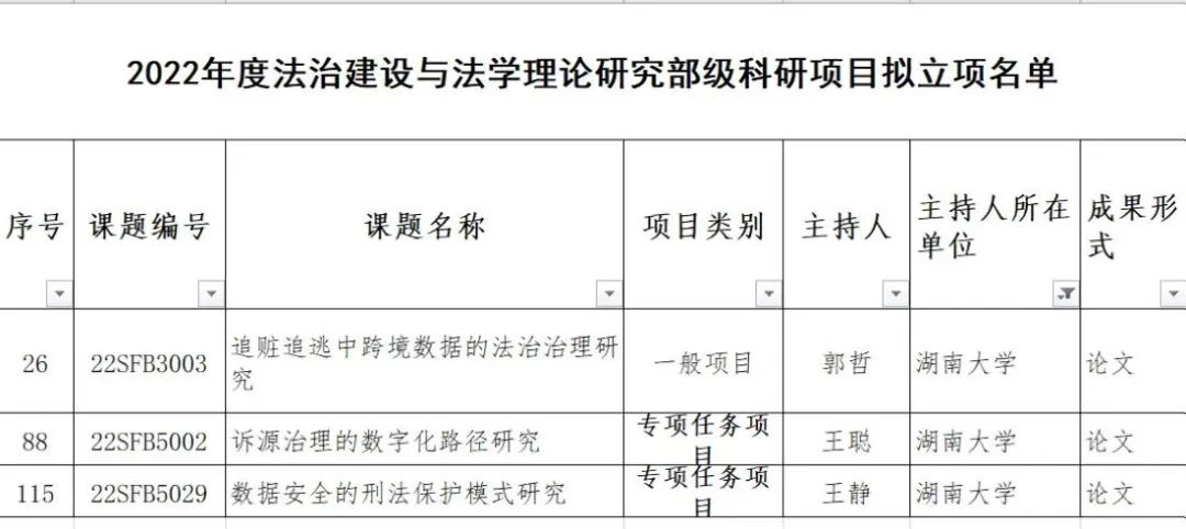 郭哲老师的“追赃追逃中跨境数据的法治治理研究”获得一般项目立项,王静老师的“数据安全的刑法保护模式研究”和王聪老师的“诉源治理的数字化路径研究”获得专项任务项目立项。