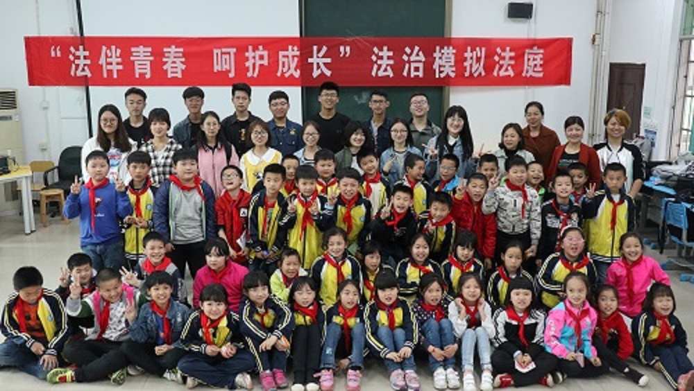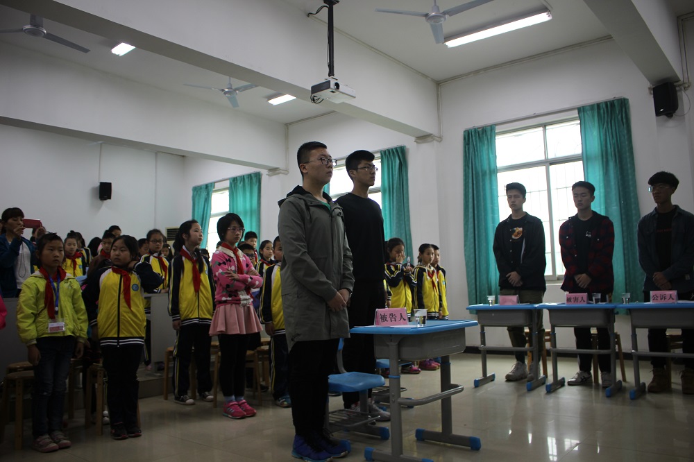 师生的支持和帮助表示衷心的感谢。本次普法教育活动分为两个部分,韩明慧同学带领部分志愿者在一年级教室通过趣味知识问答、播放法制动画小短片等形式生动地介绍了生活中的法律小常识,引导小同学们认识法律、了解法律,课堂上充满了欢声笑语。另一边,谷雨同学和陆明炜同学与其他志愿者一起模拟了“中学生李北持刀抢劫致人轻伤”一案的审判现场,小朋友们从中认识了庭审角色,感受了法庭氛围。互动环节中小同学们积极举手回答问题,表达自己对法律的认识和对模拟案件的看法。“从今天的模拟审判中我认识到了沉迷网络的危害,明白了不能损害他人的人身安全和财产权利,不能因一时的私欲而触犯法律”,一名四年级的同学这样说到。