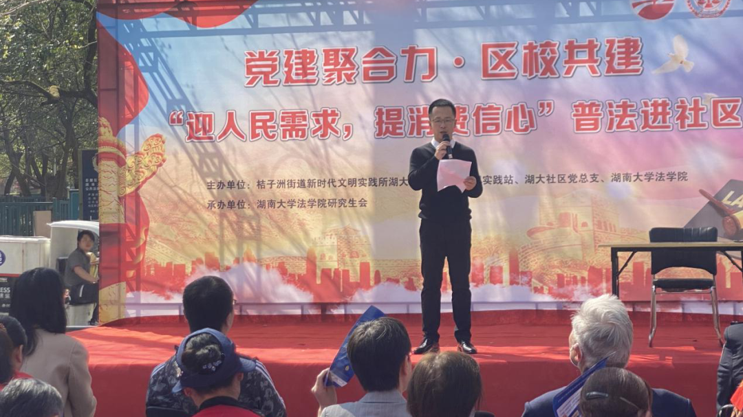 活动伊始,党务与学生工作办公室主任刘岳峰老师为本次活动致辞,他指出:依法为纲,崇法善治,循法而行,依法而治。了解消费者权益保护的相关问题与广大居民朋友日常生活密切相关,学会在生活中运用法律武器科学维护自身合法权益十分重要。并对之后区校持续共建交流合作,开展普法宣传活动,服务法治实践进行了展望。