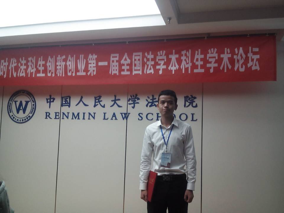 2013级本科生吴永盛同学在助理教授朴成姬老师的指导下撰写了题为《我国股权众筹的法律监管问题研究——以投资者保护为核心》的学术论文,该文章在全国众多参选作品中脱颖而出,获得评审老师认可,获评第一届全国法学本科生学术论坛优秀论文并受邀赴中国人民大学参加本次论坛。